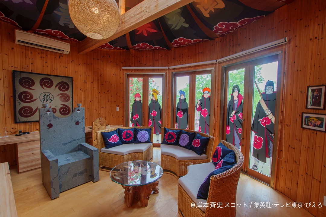 そして、この度、コラボルーム第2弾として、「NARUTO-ナルト- 疾風伝」で大人気のS級犯罪組織“暁”のメンバーが一堂に会し、各キャラクターのストーリーに合わせたデザインやインテリアが楽しめる コラボルーム『“暁”のコクーン』を開設いたします。本コラボルームは最大4名が宿泊可能で、うちはイタチが弟サスケを待ち迎えるときに座っていた「イタチの椅子」をはじめ、“暁”をモチーフにしたインテリアや限定オリジナルグッズなど、まるで“暁”の一員になったかのような特別な宿泊体験をお楽しみいただけます。